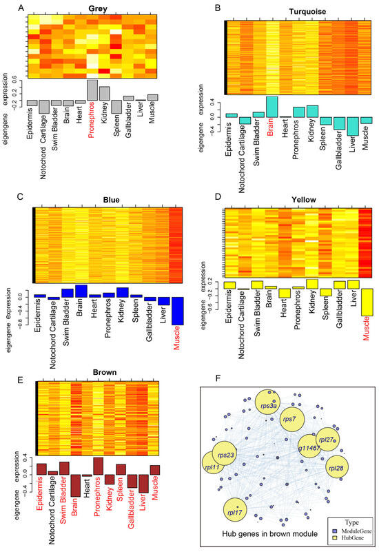 Additionally, the module eigengene serves as a representative gene expression profile, encapsulating the expression patterns of all genes within the respective module. The expression profiles of the module eigengenes corresponding to the five identified modules from WGCNA are shown in Figure 8. Compared to other tissues, the eigengene of the grey module showed a notably high expression in pronephros tissue (Figure 8A), whereas the turquoise module was specifically highly expressed in the brain (Figure 8B). The blue module and the yellow module exhibited the highest negative expression of eigengene in muscle, suggesting a significant correlation between muscle and the two modules (Figure 8C,D). Regarding the brown module, the eigengene expression across nine tissues (with the exception of the notochord cartilage and heart) exhibited a notable degree of similarity and uniformity. This finding suggested a robust correlation between the brown module and the other nine tissues, excluding the notochord cartilage and heart (Figure 8E). Additionally, the expression profiles of eigengenes corresponding to the five identified WGCNA modules are consistent with our findings derived from the gene module-gene trait correlation analysis. Subsequent identification of hub genes within the aforementioned modules revealed that only those hub genes that satisfied the established criteria were present in the brown module. The identified hub genes included rps3a, rps7, rps23, rpl11, rpl17, rpl27, rpl28, and g11467 (Figure 8F); except for the g11467 gene, whose function is unknown, the remaining genes were all typical genes encoding ribosomal proteins (RPs), and the GO terms related to those genes included RNA binding and structural constituent of the ribosome [47].
