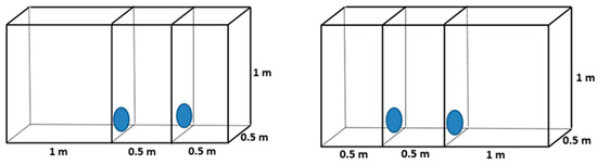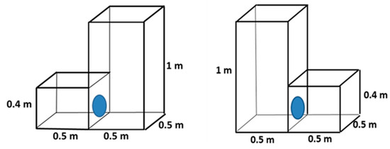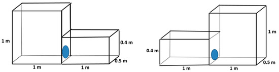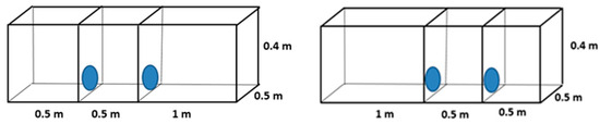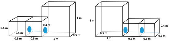 Both cages had a floor area of 0.25 m2. One cage was 0.4 m high, and the other was 1 m high (Figure 4). The number of chinchillas was 14, evaluated over 70 (14 × 5) days.