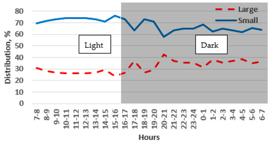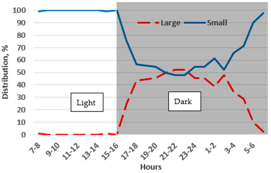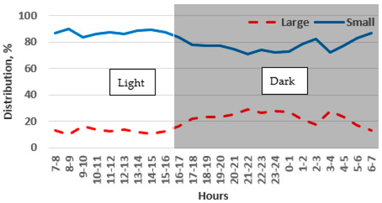During the light period, 13% of the chinchillas preferred the large cage, while during the dark period, 23% preferred the large cage. The majority of the chinchillas chose the small cages for resting. Even during their active periods, the small cages were chosen about three times more frequently than the large ones (p < 0.001). Preference for small cages peaked during the light phase (between 6:00 and 16:00), reaching nearly 90% (Figure 9). After the beginning of the dark period, there was a decline in preference for small cages, reaching approximately 70% around midnight. The opposite trend can be observed in the choice of the large cage (Figure 8).