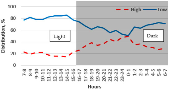 Adult chinchillas showed a clear preference for the low cage during the light phase (81%) compared to the dark phase (62%) (p < 0.001). The highest preference for the low cage was observed between 7:00 and 15:00 (about 80%), while this value decreased to 50% after midnight and then rose again (Figure 9).