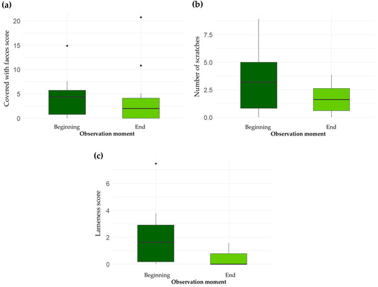 Boxplots showing the differences in the scores for the welfare indicators “Covered with faeces” (a), “Scratches” (b), and “Lameness (c) for finisher pigs at the beginning and end of the longitudinal study. The score for “Covered with faeces” is the mean percentage of the skin surface on one side of the body that was covered with faeces for all observed pigs. The score for “Scratches” is the mean number of scratches on one side of the body for all observed pigs. The score for “Lameness” is the mean score from 0 (best) to 100 (worst) for all observed pigs. The line in each box represents the median. N = 12.