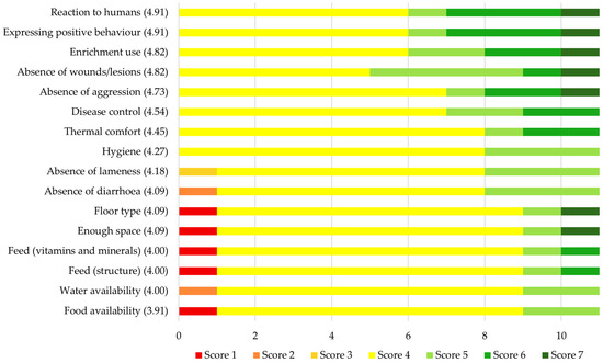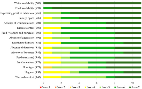 Farmers’ opinions on the importance of 16 aspects of pig welfare rated between 1 (not important at all) and 7 (very important) at the beginning of the study. All individual scores are displayed. Welfare aspects are shown in order from the highest to the lowest mean rating, which is displayed between brackets behind the name of each welfare aspect. N = 11.