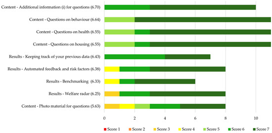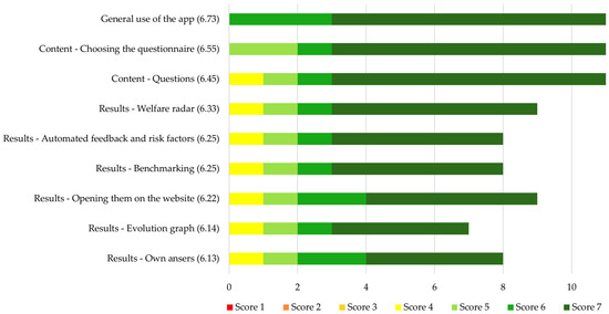 The mean ratings for the usefulness of the elements of the PIGLOW app ranged between 5.63 and 6.70 on a scale from 1 (not useful at all) to 7 (very useful), indicating that on average, the farmers found all of the aspects useful (Figure 6). Farmers found “Additional information for questions” (6.70 ± 0.48) the most useful, while the usefulness of “Photo material for questions” (5.62 ± 1.51) received the lowest mean rating. Not all elements were rated by all farmers, with the number of ratings per element varying between 6 and 11.