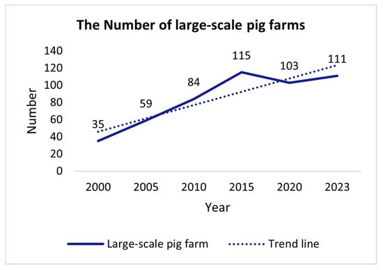 First, there has been a demographic shift in livestock farms. The aging rate of livestock farm owners (aged over 65 years) in Korea reached 43.6% in 2019, an increase of 18.4% from 2005. Despite the labor shortage and the aging trend, large-scale farms with more than 10,000 animals have seen an annual growth rate of 7.9%. This makes livestock management increasingly difficult [2]. The annual number of large-scale pig farms in South Korea is shown in Figure 1. This situation is not limited to South Korea. In the EU, for example, the aging rate (age over 65 years) in the livestock industry is 41.3%, and in the United States, the average age of farm owners is 57.5 years. This trend limits the smooth transfer of knowledge and skills to younger generations, which could be detrimental to the sustainability and growth of the livestock industry [3,4,5].