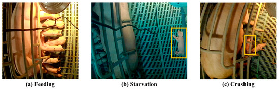 This study used 1920 × 1080-resolution video data, continuously recorded at 59.89 fps at all hours from 20 August to 18 September 2023 at ProFarm Corporation, an agricultural company in South Korea. The dataset consisted of videos of 50 sows captured using 25 cameras (Fix XA-501). The sows used in this study were two-way crossbreeds of Landrace and Yorkshire, while the piglets were three-way crossbreeds, produced by inseminating these sows with Duroc semen. Each video contained scenes showing the interactions between two sows and various piglet behaviors. The behaviors included four types of sow behaviors (standing, sitting, lying down, lying sideways) and three types of piglet behaviors (feeding, starvation, and crushing). These 5–30 s long videos were extracted frame by frame for training the YOLO network. During this process, the consecutive frames hardly differed in their data characteristics. To create data with diverse features, the frame was extracted at 3 s intervals. This resulted in 2860 images of 50 sows. The data were verified and labeled by livestock experts and divided into training, validation, and test sets in a ratio of 3:1:1 based on sow IDs. Thus, the training set included data collected from 30 sows, whereas the validation and test sets included data collected from 10 sows each. Performance evaluation was conducted using k-fold cross-validation (k = 3), enhancing the robustness of the assessment by mitigating potential overfitting and allowing a more comprehensive evaluation across varied data partitions. This approach ensures that each subset of the dataset contributes to both training and validation, thus strengthening the generalizability of the model’s performance metrics. Table 1 lists the number of labels for each behavior, and Figure 2 shows example images of piglet behaviors, including crushing, feeding, and starvation.