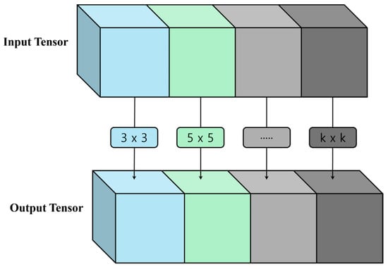 However, several recent studies have reconsidered the concept of optimal kernel size [21,22,23,24]. One of these studies by Liu Z. et al. (2022) argued the limitations of using only one kernel size and proposed an architecture, termed MixConv, that uses both large and small kernel sizes to extract high- and low-resolution features. In general, the parallel application of multiple kernel sizes significantly increases computational complexity. To solve this problem, MixConv uses a group convolution, where the feature map is divided into several groups and different kernel sizes are applied to each group. Figure 3 shows the MixConv architecture, which was calculated using Equations (1) and (2). Equation (1) represents the process of dividing the feature map channels into g groups, and then performing a convolution for each group. X is the input tensor, Y is the output tensor, k is the kernel size of the tth group, m is the channel multiplier, c is the size of the input channel, and W is the weight of the feature map. The final output tensor is obtained by concatenating the tensors using Equation (2).