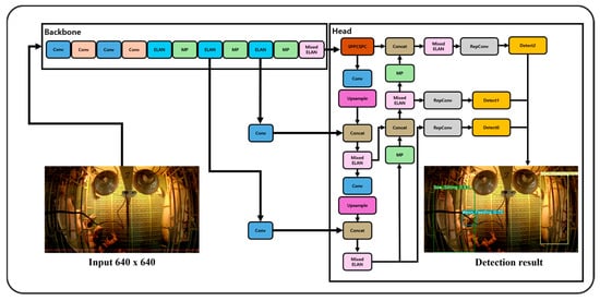 YOLOv7 improves learning capabilities using expand, shuffle, and merge cardinality operations based on an ELAN architecture that allows layers to learn diverse features through a gradient path [18]. It also applies bag-of-freebies (BoF) techniques to improve performance without increasing the inference cost. Examples of BoF include the proposal of a re-parameterized convolution, RepConvN, and the addition of an auxiliary head to improve performance enhancement through assistant loss.