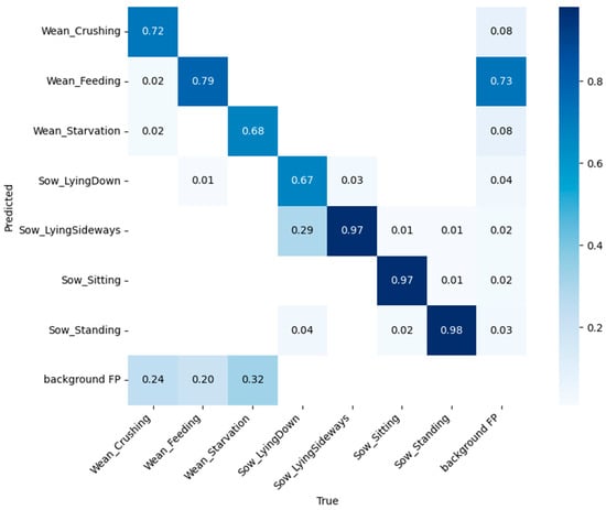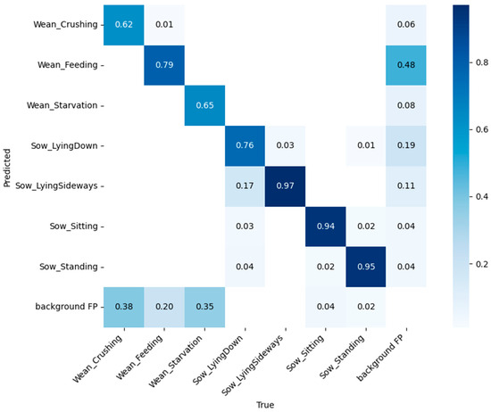 YOLOv7 with mixed-ELAN showed an improvement of 5.3% in crushing detection and a 6.3% improvement in lying down detection compared with the YOLOv7 model. Additionally, for crushing detection, precision increased by 5.7% and recall by 1.7%. In pig farming, crushing is the most important behavior to detect as it is linked to piglet survival [25]. In addition, prolonged lying down behaviors of sows can lead to longer fasting times for piglets, which negatively impacts their growth. From this perspective, the improvement in performance with the proposed architecture is extremely beneficial. The detection performance improved by 1.5% across all classes. The confusion matrix of YOLOv7 with the application of Mixed-ELAN is presented in Figure 6.
