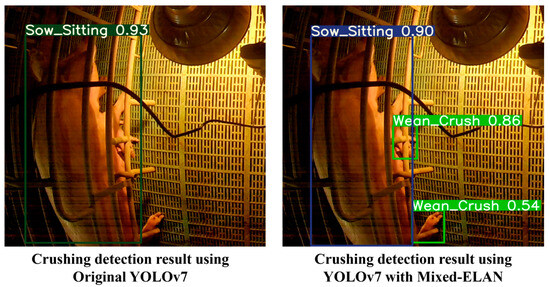 The application of mixed-ELAN in both YOLOv7 and YOLOv9 consistently improved the identification of crushing behavior. This indicates that the proposed architecture contributes to the model’s ability to recognize objects through its multikernel operations by comprehensively considering both the object and surrounding environmental information. The proposed architecture improved the detection and identification of crushing and lying down behaviors in piglets and sows, respectively. Figure 8 compares the detection results of YOLOv7 with mixed-ELAN and the original ELAN architecture for crushing behavior in piglets.