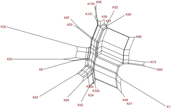 SplitsTree network of extended-spectrum cephalosporin-resistant Escherichia coli. Abbreviations: K, fecal sample.