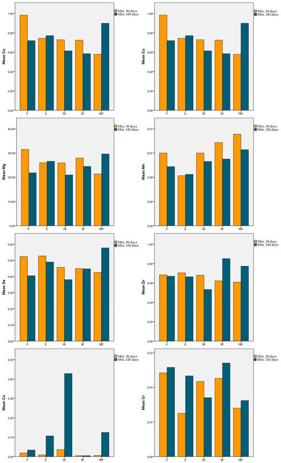 The mean serum Mn levels in P, PE, EF, and PEF were lower in the min. 120-day treatment duration group than in the min. 30-day group. However, these differences were not statistically significant (p > 0.05). In addition, it was observed that the mean serum Mn level in E was measured at the same concentration in the short- and long-term treatment groups (p > 0.05). In the comparison of treatment groups within both treatment durations, no significant difference was observed (p > 0.05) (Table 10) (Figure 1).