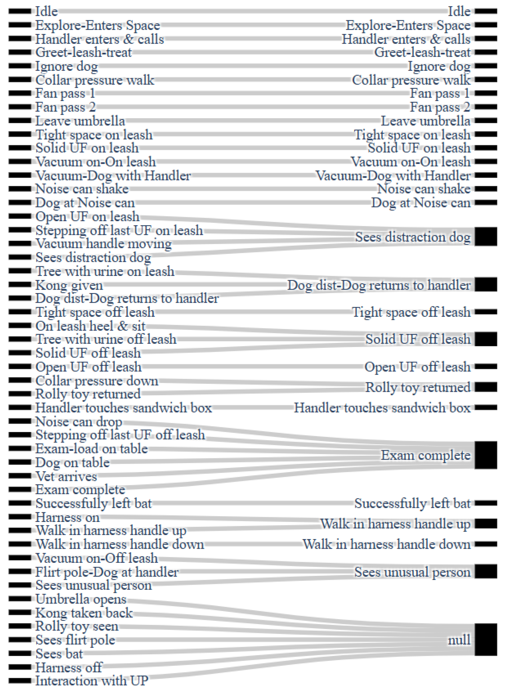 We also observed that not all states were easily identifiable. Seven of the fifty states mapped to “null”, meaning that they could not be consistently identified from the models, and others mapped to one similar state. For instance, we see several larger aggregate states around “Sees distraction dog” and “Exam complete”. From our findings, as potential improvements for future IFT tests, we recommend removing stand-alone null-mapped states, such as “Rolly toy seen” or “Sees bat”, as these states are difficult to identify from the data. Some of the aggregate states indicate too much similarity between subdivided tasks. The “Exam-load on table”, “Dog on table”, “Vet arrives”, and “Exam complete” states, for instance, could be grouped into one “Exam” superstate, reducing the total number of test states. These recommendations could help simplify the standard IFT testing and data analysis.