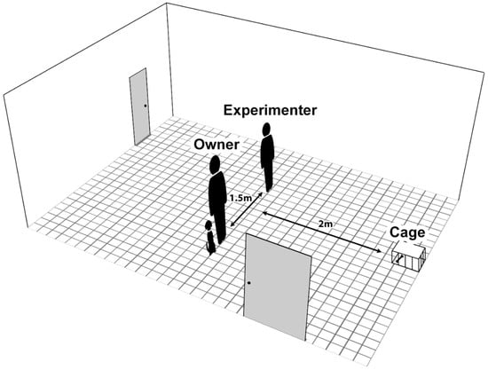 After the training phase, the O and D left the room. The E put 10 pieces of treats on the plate and placed the plate in the cage, then closed its door. The O and D were called back to the testing room, and when they arrived back to their starting point, the O let the D go, and the D was free to try to obtain the reward and also freely move around for 90 s. In this phase, the D was unable to obtain the treats from the closed cage. The O and E stood silent at their spots during the test (i.e., neither of them were allowed to encourage the dog to obtain the food).