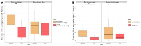 The results of the between-context (non-social vs. social test) comparisons for separate analyses of dominant and subordinate dogs in the case of (A) time spent gazing at the cage in the non-social test and the experimenter in the social test and (B) time spent gazing at the owner. The box shows the interquartile range between the lower and upper quartiles, divided by the median. The whiskers extend to the minimum and maximum values excluding the outliers; the dots show the outliers (more than 1.5 times the lower/upper quartile beyond the box). NonSoc = non-social test condition; Soc = social test condition; E = experimenter. The asterisks show significance in the following way: ** p <0.01.