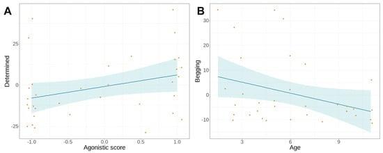 We found no association between the principal components and the holistic rank score in either of the tests. Using the agonistic and leadership subscores separately in the model selection, we found a significant association between the agonistic score and the determined PC: dogs with higher agonistic scores were more determined in the non-social test (β = 0.4297, SE = 0.17, t = 2.563, 95%CI = (0.1011–0.7583), p = 0.0104, Figure 4A). The only other association in the non-social test was between age and begging: older dogs begged the experimenter less (β = −0.1495, SE = 0.07, t = −2.028, 95%CI = (−0.2939–−0.0050), p = 0.0425, Figure 4B).