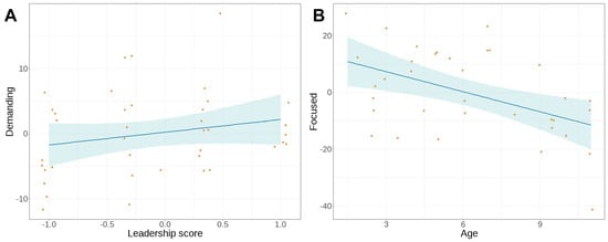 In the social test, we found a significant positive association between the leadership score and “Demanding” (β = 0.3945, SE = 0.11, t = 3.514, 95%CI = (0.1745–0.6145), p = 0.0004, Figure 5A). Another significant association we found was between “Age” and “Focused”, older dogs being less focused on the experimenter than younger ones (β = −2.3546, SE = 0.76, t = −3.115, 95%CI = (−3.8334–−0.8758), p = 0.0037, Figure 5B). We found no other associations in the social test.