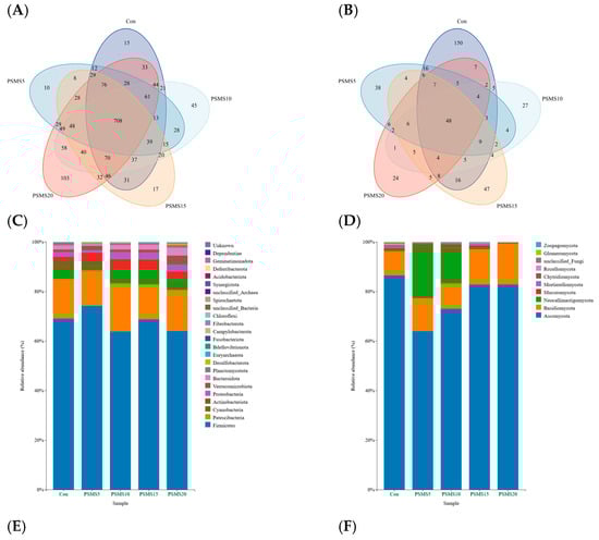 Sequences were clustered at a 97% similarity threshold, resulting in 1793 operational taxonomic units (OTUs) for bacteria and 470 OTUs for fungi across 25 samples (Figure 2A,B). Among the bacterial OTUs, 708 were common to all five groups, accounting for 39.49% of the total OTUs. The number of unique OTUs in Con, PSMS5, PSMS10, PSMS15, and PSMS20 was 15 (0.83%), 10 (0.56%), 45 (2.51%), 17 (0.95%), and 105 (5.86%), respectively. PSMS20 had the highest number of unique OTUs, while PSMS5 had the lowest. Among the fungi OTUs, the common OTUs of all five groups was 48, accounting for 10.21%. The number of unique OTUs in the five groups was 150 (31.91%), 38 (8.09%), 27 (5.74%), 47 (10.00%), and 24 (5.11%), respectively. The Con group had the highest number of unique OTUs, while PSMS20 had the lowest.