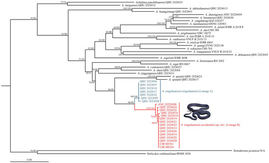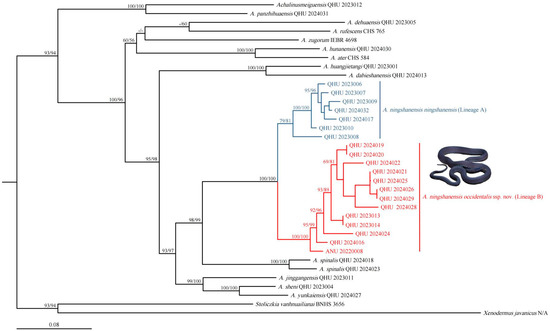 In Yang et al. [12], the molecular phylogenetic analysis showed that A. ningshanensis formed the sister group to A. yangdatongi Hou, Wang, Guo, Chen, Yuan and Che, 2021, and was then clustered together with A. juliani Ziegler, Nguyen, Pham, Nguyen, Pham, Van Schingen, Nguyen and Le, 2019 and A. ater Bourret, 1937 (Figure 4); however, this result appears inconsistent with actual phylogenetic relationships. We propose that the sequences ON548422 and ON548423 in Yang et al. [12] are erroneous. The accurate phylogenetic position and sequences of A. ningshanensis should be based on the findings in this study (Figure 2 and Figure 3; Table 1).