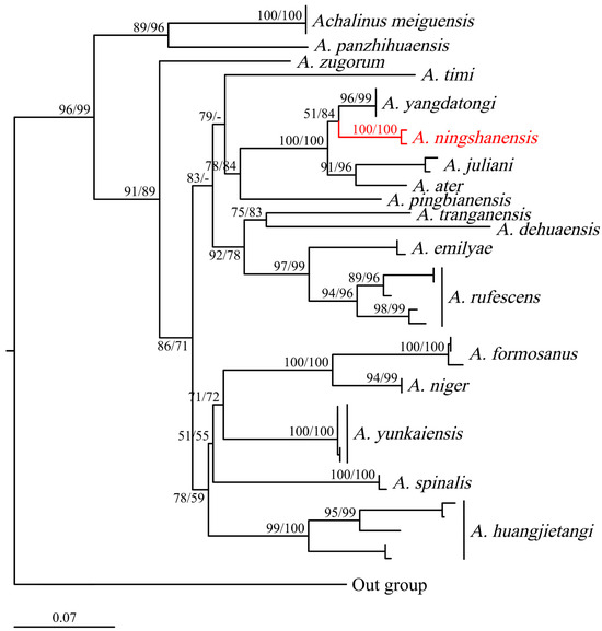Maximum likelihood tree of the genus Achalinus inferred from four mitochondrial (12S/16S/CO1/cyt b) fragments. The nodes supporting values on branches are presented with the SH-like approximate likelihood ratio test (SH)/Ultrafast Bootstrap Approximation (UFB); the ones lower than 50 are displayed as “–”.