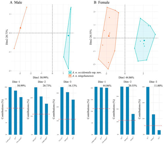 Male (A) and female (B) PCA plots between Achalinus ningshanensis occidentalis ssp. nov. and A. n. ningshanensis and bar plots of the percent contribution of each data type to Dim 1–3 of the PCA. The percentage score at the top of each bar plot is the percent contribution of that dimension to the overall variation in the dataset. The red dotted lines in the bar plots represent the mean percentage values.