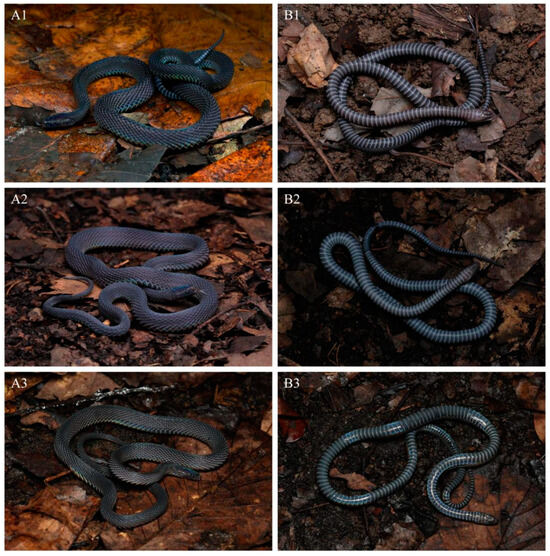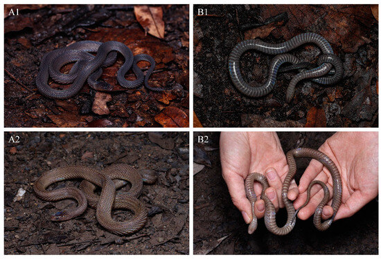 Dorsal (A) and ventral (B) views of living Achalinus ningshanensis ningshanensis. (A1,B1): QHU 2024017, male, from Ningshan County, Shaanxi Province; (A2,B2): QHU 2023009, female, from Ningshan County, Shaanxi Province. Photos by Yuhao Xu. Scale bars are not shown.