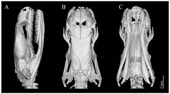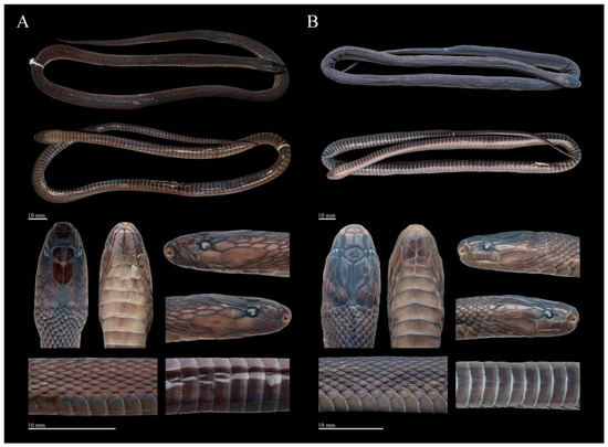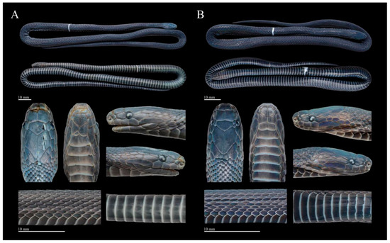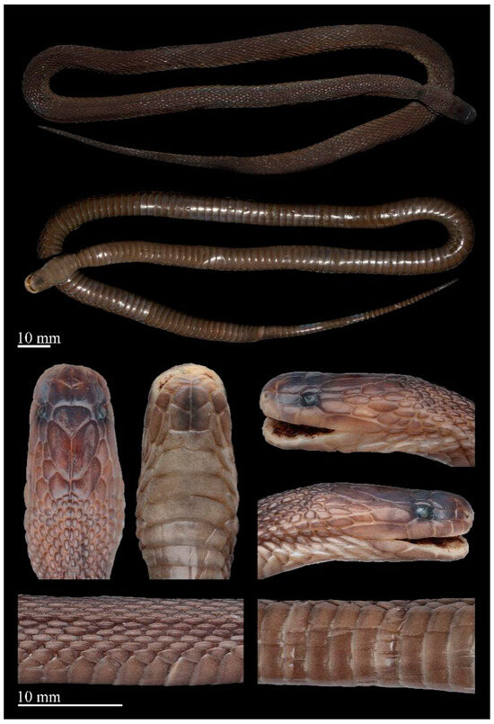 The terminology and methods of measurement characteristics and scalation counts followed Zhao [17], Ma et al. [13], and Xu et al. [18]. Bilateral morphological character measurements and scale feature counts were given as left/right. The utilization of abbreviations for morphological characteristics follows the conventions established by Darko et al. [19]. Three measurement characters were measured with a Deli Stainless Ruler (No. 8462) to the nearest 1 mm: SVL (snout–vent length), TAL (tail length), and TL (total length), and all other measurements were performed using Deli digital calipers (DL312200) to the nearest 0.1 mm: HL (head length) was taken from the tip of snout to the posterior margin of mandible; HW (head width) was measured around the widest part of the head in dorsal view; LorH (loreal height) was measured from the highest part to the lowest part of the loreal in the lateral view; LorL (loreal length) was measured from the most anterior loreal to the most posterior loreal in lateral view; LSBI (length of the suture between internasals); LSBP (length of the suture between prefrontals); ED (eye diameter) was taken from the anterior corner of the eye to the posterior corner. The scalation features are listed as follows: SL (supralabials); IL (infralabials); IL-1st Chin (infralabials touching the first pair of chin-shields); Lor (loreals); PRO (preoculars); PO (postoculars); TEMP (temporals); aTEMP-Eye (the number of anterior temporals touching the eye); SPO (supraoculars); DSR (dorsal scale rows), counted at one-head-length behind the head, at midbody, at one-head-length before the cloacal plate; VS (ventrals), counted from the anterior-most wide ventral scale after the chin-shields, following the midline, and concluding before the cloacal plate, CP (cloacal plate), and SC (subcaudals). The keeling states of the outer-most dorsal scale rows (KOD) were measured from the same positions as where we counted the dorsal scales. The number of the maxillary teeth (MT) was confirmed through scanning photography obtained by nano-computerized tomography (CT). Scans were performed using a GE V|tome|X m dual tube 300/180 kV system (developed by the Institute of High Energy Physics (IHEP), Chinese Academy of Sciences) at the Key Laboratory of Vertebrate Evolution and Human Origins, Institute of Vertebrate Paleontology and Paleoanthropology (IVPP), Chinese Academy of Sciences. The specimens were scanned with an energy beam of 80 kV and a flux of 80× μA using a 360° rotation and then reconstructed into the 4096 × 4096 matrices of 1536 slices. The final CT-reconstructed skull images were exported with a minimum resolution of 11.0 μm. Skull images were exported from the virtual 3D model reconstruction using Volume Graphics Studio ver. 3.4.0. Morphological comparison between species of the genus Achalinus were obtained from the specimens examined in this study and many key references [1,2,3,4,5,6,7,8,9,10,11,12,13,14,15,16,17,18,19,20,21,22,23,24,25,26,27,28,29,30,31,32,33].