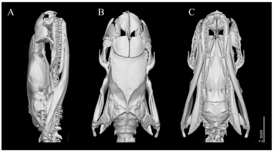 Genomic DNA was extracted from preserved liver tissues using QIAamp DNA Mini Kit (QIAGEN, Changsheng Biotechnology Co., Ltd., Changchun, China). Four mitochondrial gene fragments were targeted for phylogenetic analysis, including the 12S ribosomal RNA (12S), 16S ribosomal RNA (16S), cytochrome c oxidase subunit 1 gene (CO1), and cytochrome b (cyt b). PCR conditions followed previously reported protocols; 12S was amplified by primers 12S2LM (5′-ACACACCGCCCGTCACCCT-3′)/16S5H (5′-CTACCTTTGCACGGTTAGGATACCGCGGC-3′) [34], 16S was amplified by primers 16Sar_L (5′-CGCCTGTTTATCAAAAACAT-3′)/16Sbr-H (5′-CCGGTCTGAACTCAGATCACGT-3′) [35], CO1 was amplified by primers Chmf4 (5′-TYTCWACWAAYCAYAAAGAYATCGG-3′)/Chmr4 (5′-ACYTCRGGRTGRCCRAARAATCA-3′) [36], and cyt b was amplified by primers L14910 (5′-GACCTGTGATMTGAAAACCAYCGTTGT-3′)/H16064 (5′-CTTTGGTTTACAAGAACAATGCTTTA-3′) [37]. PCR products were sequenced by Shanghai Map Biotech Co., Ltd. The raw sequences were assembled using SeqMan in the DNASTAR v.11.1 software package [38] and aligned in MEGA X [39]. The newly generated sequences have been submitted to GenBank (Table 1).