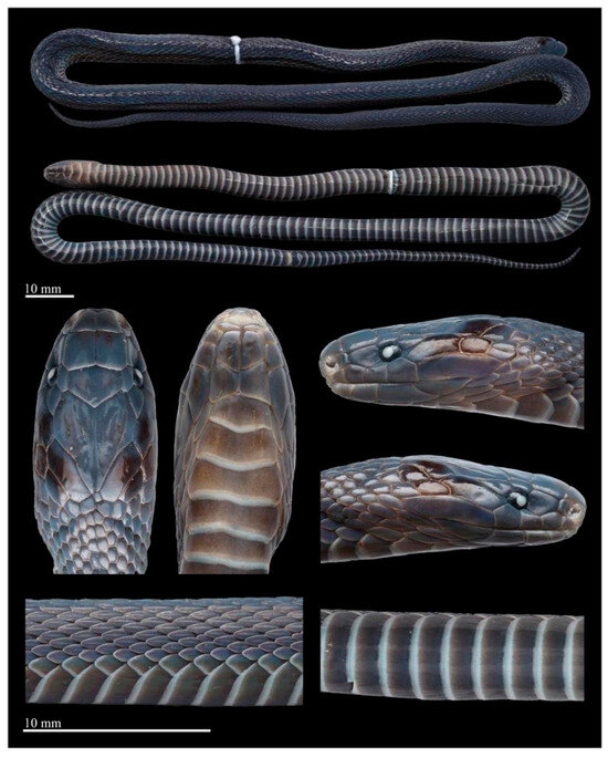 Preserved specimen of the ANU 20220008 (adult female, paratype of Achalinus ningshanensis occidentalis ssp. nov., from Taibai County, Shaanxi Province). Photos by Diancheng Yang. Scale bars: 10 mm.