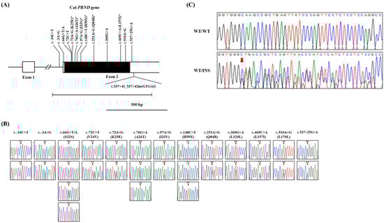 Identification of novel polymorphisms of the prion-like protein gene (PRND) in cats. (A) The gene diagram displays the genomic structure of the feline PRND gene. The open reading frame (ORF) within exon 2 is depicted as a black box, and the 5′ and 3′ untranslated regions (UTRs) from exon 1 to exon 2 are shown as white boxes. Horizontal lines with caps at the beginning and end indicate the full lengths of the PCR products analyzed in this study. Vertical and folded lines indicate the positions of the single nucleotide polymorphisms (SNPs) identified in this study, with an asterisk denoting each non-synonymous SNP. The Y-shaped bar indicates the insertion/deletion polymorphism. (B) Electropherograms display 13 novel SNPs discovered in the feline PRND gene. The genotypes for each SNP are shown: c.–34C>T, c.–3A>G, c.66G>T, c.72C>T, c.73A>G, c.76G>A, c.97A>G, c.148C>T, c.251A>G, c.360G>A, c.469C>A, c.510A>G, and c.537+25G>A. Arrows indicate the position of each SNP in the top label. (C) Electropherograms display the insertion polymorphism (c.537+41_537+42insGTGAG) discovered in the feline PRND gene. The upper panel shows the WT/WT homozygosity of the feline PRND. The lower panel shows WT/insertion heterozygosity of the feline PRND. Arrows indicate the start of the insertion. The peaks in the DNA sequence are color-coded, with green representing adenine, red for thymine, blue for cytosine, and black for guanine.