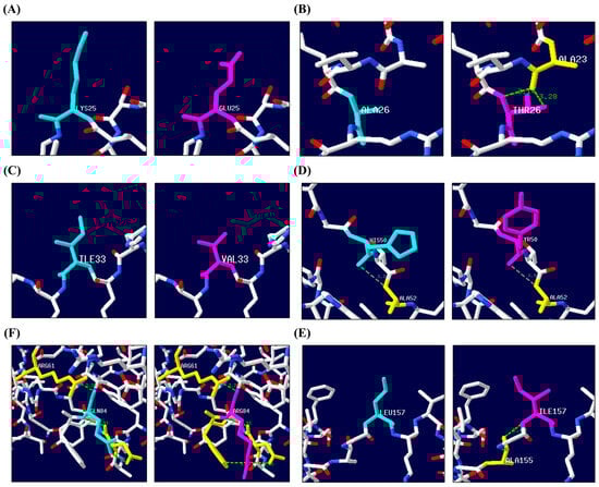 Structural analysis of the feline prion-like protein (Doppel) according to the non-synonymous single nucleotide polymorphisms (SNPs). The tertiary structures of cat Doppel with the SNPs (A) SNP c.73A>G (K25E), (B) SNP c.76G>A (A26T), (C) SNP c.97A>G (I33V), (D) SNP c.148C>T (H50Y), (E) SNP c.251A>G (Q84R), and (F) SNP c.469C>A (L157I) were predicted by ColabFold v1.5.5 and visualized using Swiss PDB Viewer 4.1. In each panel, the wildtype amino acids are highlighted in cyan on the left, and the substituted amino acids are shown in magenta on the right. Hydrogen bonds (H-bonds) within the specified distance range are depicted with light green dotted lines, and weaker hydrogen bonds, which can extend by an additional 0.05 Å by default, are shown in gray. The residues surrounding these hydrogen bonds are highlighted in yellow.