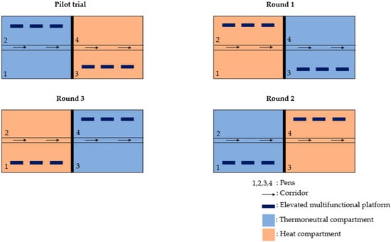 The experiment consisted of a pilot trial followed by the experiment proper, which included three consecutive rounds. All experiments were conducted in the same barn, which was divided into two compartments separated by a solid wall (Figure 1). In each compartment, there were two pens (9 × 4 m, Figure 2) either enriched with three multifunctional platforms (platform) or not (barren). After each round, the platforms were moved to the other pen within the same compartment. During each round and in alternating order, heat stress was induced in one of the compartments (heat) but not in the other compartment (thermoneutral). This resulted in a two-factorial block design with thermal conditions (heat stress vs. thermoneutral) as the first factor and enrichment (platforms vs. barren) as the second factor.