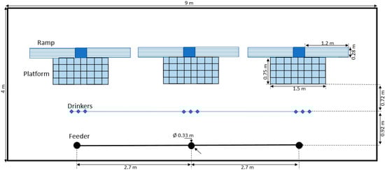 Top-view layout of an enriched experimental pen showing the dimensions and positions of the multifunctional platforms, drinker line and feeding line. The barren pens were identical, except that there were no platforms.