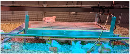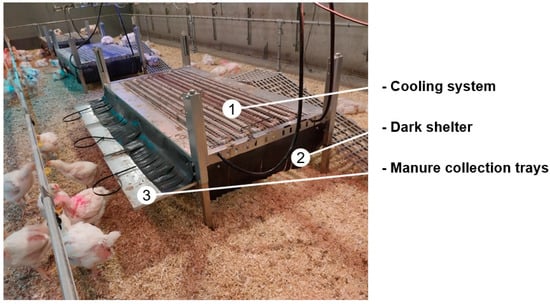 In addition to the perching functionality, the elevated platforms were designed to provide three additional functionalities (Figure 5). (1) Cooling functionality with a local cooling system providing thermoregulation via the footpads and skin contact (e.g., when the belly and breast make contact with the platform as the bird sits down). Directly underneath and in direct contact with the wire mesh surface of the platform, there was a network of hollow galvanised metal pipes. The pipes system was connected to a water chiller (CNCTech, CW-5200 Industrial Chiller, China), and approximately 10 °C cool water was circulating in the system during heat stress. All elevated platforms in both compartments (thermoneutral and heat stress) were connected to this water-cooling system. (2) Dark shelter functionality to mimic somewhat the mother hen protection, the area underneath the platforms was accessible to the birds, and it was transformed into a dark, sheltered area (l × w × h: 0.75 m × 0.60 m × 0.40 m). The area was covered from all sides by black rubber (1 mm thickness), and some openings were made to create fringes that facilitate the entry and exit of birds. (3) Manure collection functionality involved collecting and weighing the manure of birds on the platforms using removable manure trays (3 per platform) installed below the grid surface. Manure was collected weekly or more frequently according to the accumulation of excreta.