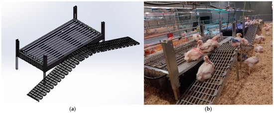 The environmental enrichment of broiler chicken houses with elevated structures has been shown to effectively promote broiler welfare. Such enrichment supports their motivation to express species-specific behaviours, such as perching, which is instinctively performed to avoid predators [1]. Different elevated enrichments, including straw bales [2], perches [3], and elevated platforms [4], have been investigated. However, broilers utilise these structures more effectively when the design is adapted to their physical capabilities. Broilers have difficulties maintaining their balance on traditional perches and show a preference for elevated platforms, which better accommodate their heavy body conformation. The access to these platforms is further improved when ramps are provided [5] and when ramps are not too steep. The presence of elevated platforms has been associated with significant benefits for broilers, including an increase in comfort behaviours, enhanced mobility, improved leg health, and a reduction in fear responses [6,7].