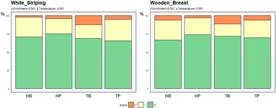 Effects of enrichment and temperature on broiler chickens breast muscle myopathies (TB: Thermoneutral-Barren, TP: Thermoneutral-Platform, HB: Heat-Barren, HP: Heat-Platform).