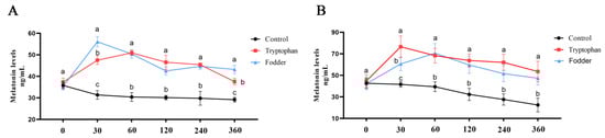 Effects of tryptophan supplementation and feed on Mel in artificial rumen. (A) Mel concentration in rumen fermentation tank of the control group. (B) SARA group. Control group was not supplemented with feed or tryptophan. Different letters indicate significant differences between groups (p < 0.05).