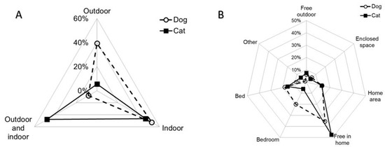 Radar graphics representing diurnal living (A) and sleeping (B) habits of dogs and cats. Each point shows the proportion of dogs (empty circle) and cats (square black) kept in a given location.