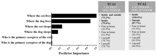 Cluster analysis of pet management. The left-side panel shows the variables included in the cluster analysis and their importance in differentiating the clusters. The questions that most contribute to cluster formation were related to the living habits of pets. The right panel describes the two clusters including the relative contribution of the categories to the overall cluster model. In TCA1 (named “Cat free-Dog indoor”), owners keeping their cat both indoors and outdoors and their dog indoors prevailed (in bold), while in TCA2 (named “Cat indoor-Dog outdoor”), owners keeping their cat indoors and their dog outdoors prevailed (in bold). The other variables did not contribute to the clustering solution as the prevailing categories coincided in the two clusters.