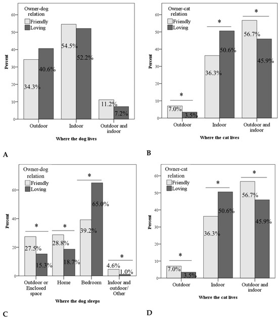 Associations between owner–pet relationship and living (A,B) and sleeping (C,D) habits of pets. * p < 0.05.