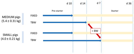 This trial was conducted in the nursery unit of a commercial farm in Catalonia (northeast of Spain) throughout the nursery period (d 1 to 36 post-weaning). A total of 528 male and female weaned commercial pigs ([Landrace × Yorkshire] × Pietrain), weaned at d 21, were moved to the nursery unit to be used in the trial. These pigs represented the smallest 50% of their batch (BW of 4.7 ± 0.74 kg). Pigs had access to creep feed during lactation. Each nursery pen (3 m2 in floor area) had a commercial non-lidded hopper (TR5, Rotecna, Spain) and a nipple drinker to ensure ad libitum feeding and free access to water. At weaning, animals were individually ear-tagged and classified into two blocks according to initial BW: medium pigs—5.4 ± 0.31 kg; and small pigs—4.0 ± 0.21 kg. Each block contained 24 pens of 11 mixed-sex pigs. Ten days after weaning, pens were assigned to two experimental feeding strategies (12 replicates for each strategy). Half of the pigs within the medium and small BW categories were switched to the starter diet that same day (d 10) following a fixed-day approach (FIXED). The remaining pigs were allowed to consume a pre-starter diet until they reached a specific BW, following a target-BW approach (TBW). The target BW was established as the average BW of the medium pigs in the TBW strategy at d 14 (Figure 1).