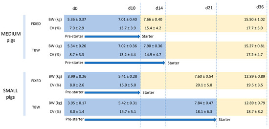 Effect of feeding strategy on the evolution of the body weight (BW) and coefficient of variance (CV) of small (weaning weight—4.0 ± 0.21 kg) and medium (weaning weight—5.4 ± 0.31 kg) pigs for two different feeding management strategies. Values are expressed as mean ± standard deviation. Differences in BW and CV between both strategies were non-significant (p > 0.05). FIXED: feeding strategy consisting of allowing pigs to consume a pre-starter diet until d10 post-weaning; TBW: feeding strategy consisting of allowing pigs to consume a pre-starter diet until achieving 7.9 kg of BW.
