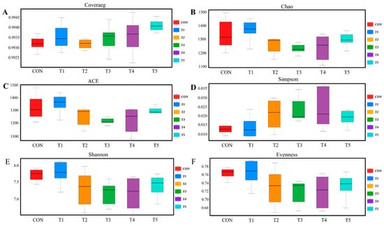 Alpha diversity analysis of the cecal microbiota of broilers. (A) Coverage Indexes; (B) Chao1 Indexes; (C) ACE Indexes; (D) Simpson Indexes; (E) Shannon Indexes; (F) Evenness Indexes.