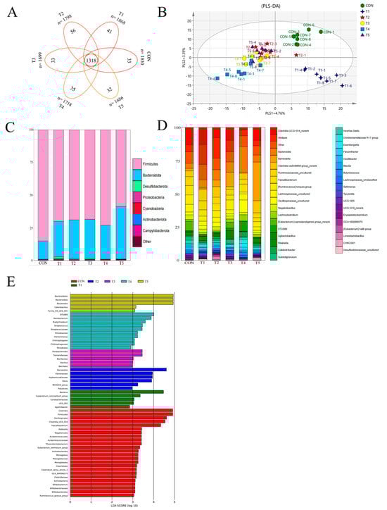 (A) OTU Venn diagram; (B) PLS-DA score scatter plot; (C) taxonomic composition of the cecal microbiota at the phylum level; (D) taxonomic composition and relative abundance of the cecal microbiota at the genus level; (E) histogram of LDA scores for taxonomic biomarkers identified by LEfSe. LDA scores (log 10) > 2 indicate enriched taxa in cases.