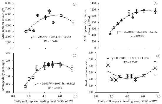 Changes in milk replacer intake (a), milk replacer dry matter intake (b), average daily gain (c), and feed conversion ratio by the daily milk replacer supply quantity in Hanwoo calves (n = 10) (d). O, milk replacer intake (quadratic effect, p < 0.001); Δ, milk replacer dry matter intake (quadratic effect, p < 0.001). □, average daily gain (quadratic effect, p < 0.001); ×, feed conversion ratio (quadratic effect, p < 0.001).