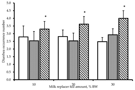 Diarrhea occurrence number according to daily milk replacer fed amount and milk replacer concentration in Hanwoo calves. □, 15% of DM; ▩, 20% of DM; ▧, 25% of DM. * Means significantly different compared to other treatments in the range of 0.05 ≤ p < 0.10.3.5. Common Blood Cell.