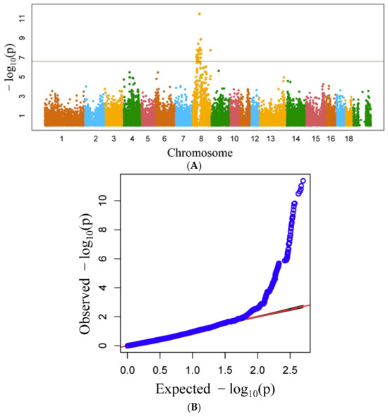 (A) Manhattan plot showing results from the genome-wide association study for coat colour traits in Wuzhishan pigs. (B) Quantile–quantile plot showing observed (black line) versus expected (blue points) log10 (p-values). The null hypothesis (no association between SNPs and coat colour) is represented by the red line.