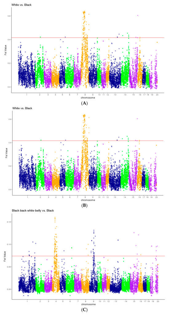 Fixation index (FST) plots generated using average FST values, with 500 Kb windows and 200 Kb overlap between adjacent windows. (A) FST plot for white vs. black. (B) FST plot for white vs. black-back/white-belly. (C) FST plot for black vs. black-back/white-belly. The horizontal red line indicates the top 1% FST values. SNPs with values above this threshold were considered to be selective sweep loci.