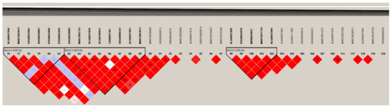 Linkage disequilibrium (LD) plot generated by Haploview4.2 for SNPs in the 10.1 Mb region between the two most significant SNPs (DRGA0008593 and ALGA0047848) in SSC8. SNP IDs are indicated horizontally across the top. The black lines indicate the identified haplotype blocks containing significant SNPs with complete linkage disequilibrium. Red diamonds represent LD between two SNPs with r2 values lower than 100% when labelled but that are equal to 100% when unlabelled.
