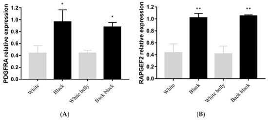 Expression of (A) RAPGEF2 and (B) PDGFRA in skin tissues from Wuzhishan pigs exhibiting one of the three possible coat colours. Results are shown as means ± SD of triplicate measurements. * indicates p < 0.05, ** indicates p < 0.01. White belly and black back are both samples from black-back/white-belly pigs.