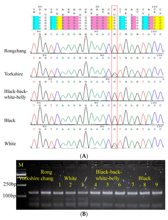 The G to A mutation located at the first nucleotide in intron 17 of KIT, which causes alternative splicing, was detected through sequencing and restriction digestion. (A) Sequence alignment of data obtained from pooled DNA samples (from 30 individuals) shows the mutation in KIT intron 17. The red column highlights the mutation site (93G > A); Yorkshire and white Wuzhishan pigs exhibit double peaks, indicating nucleotides G and A at that location, while all the other pigs showed single peaks at this location, indicating the presence of only G nucleotide. (B) Agarose gel displaying the PCR product from KIT intron 17 of Wuzhishan pigs after digestion with NlaIII. Lanes 1–3 contain DNA from white pigs, 4–6 from black-back/white-belly pigs, and 7–9 from black pigs. The three bands in the Yorkshire and white pig lanes are diagnostic of the splice mutation, while the double bands are wild type. The Yorkshire and Rongchang pigs served as positive and negative controls, respectively.